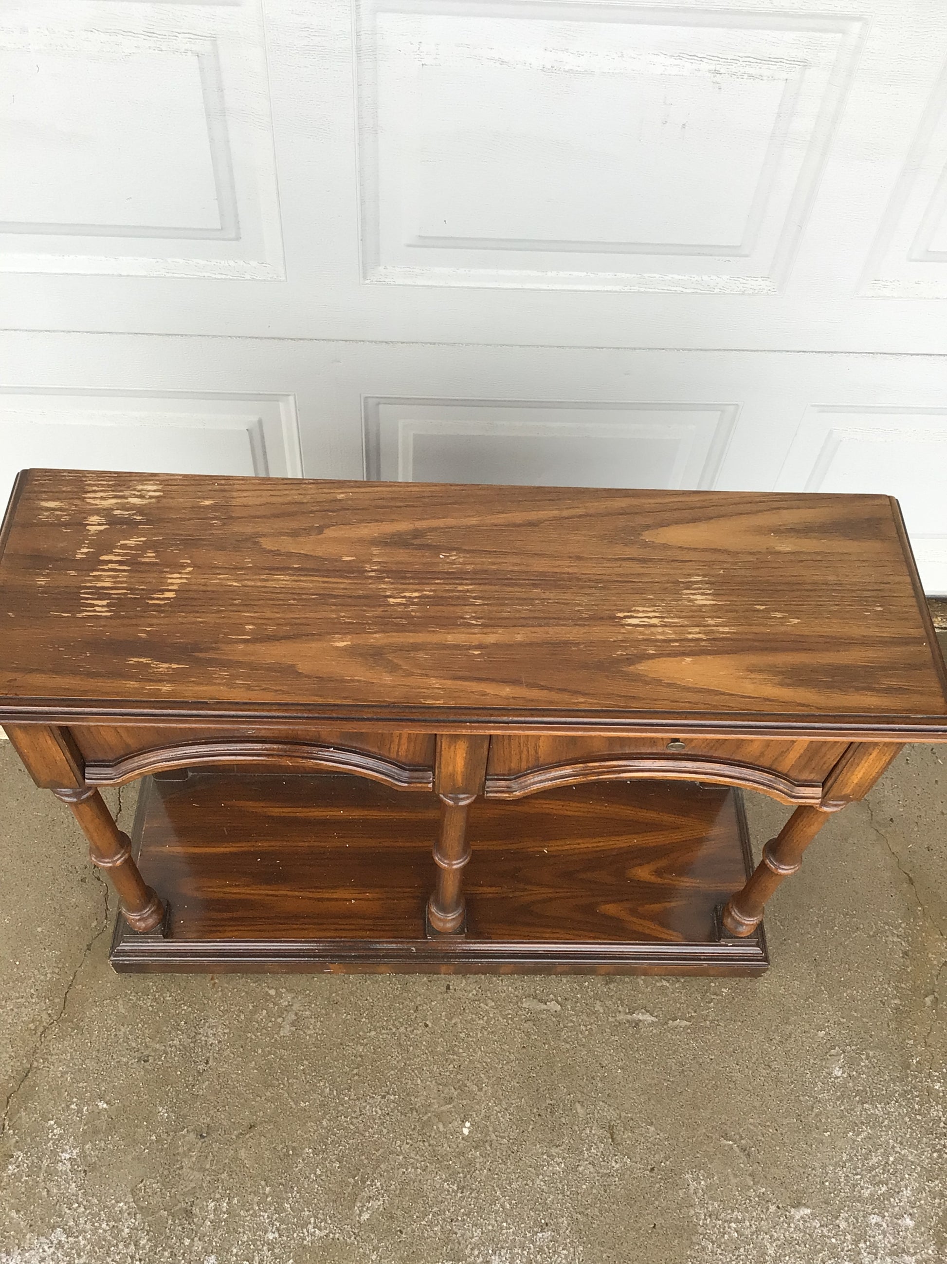 Wooden Hall Table with 2 Drawers. This wooden hall table has two drawers, the drawers are not attached. The top has marks as seen in the images.