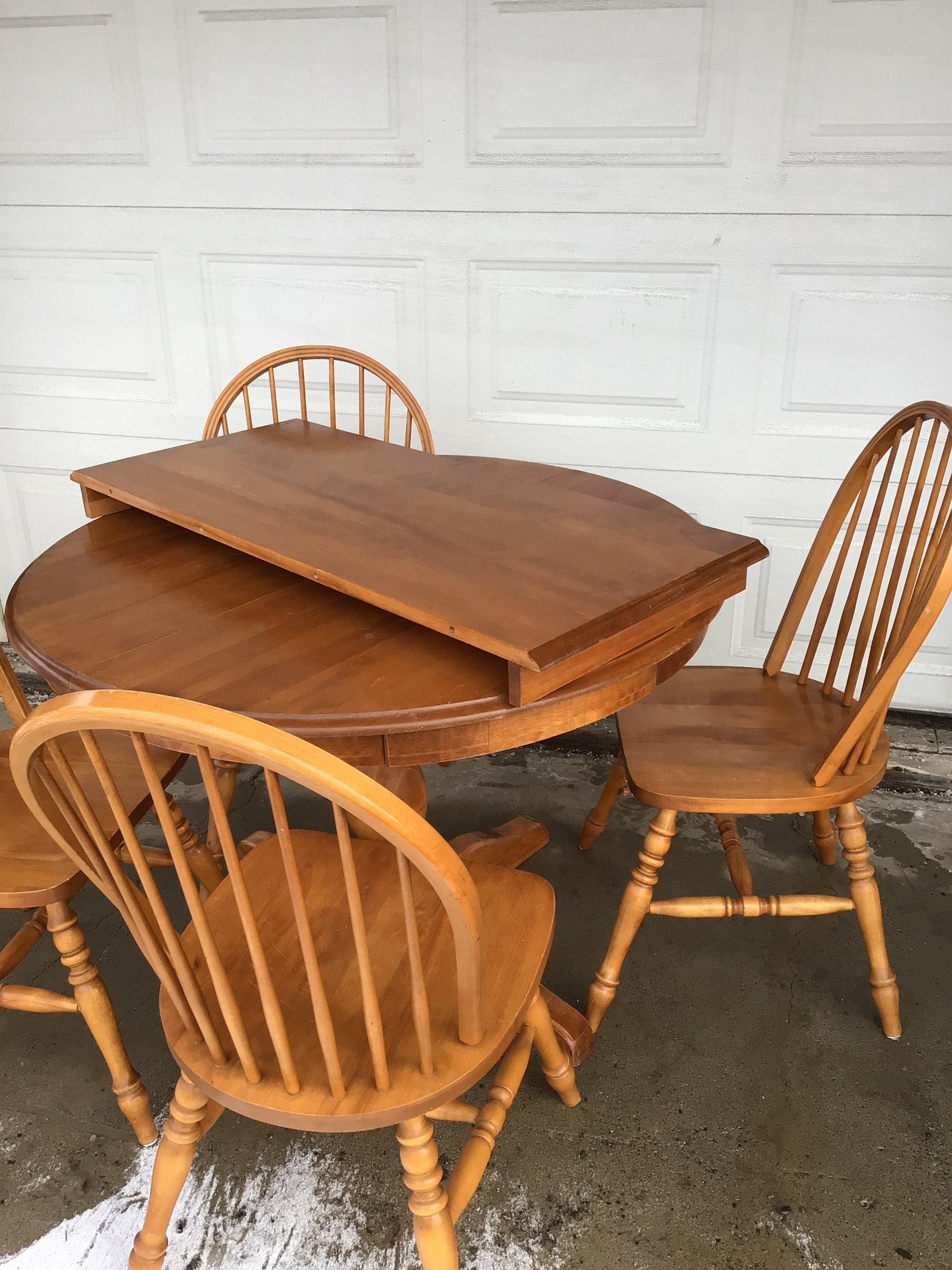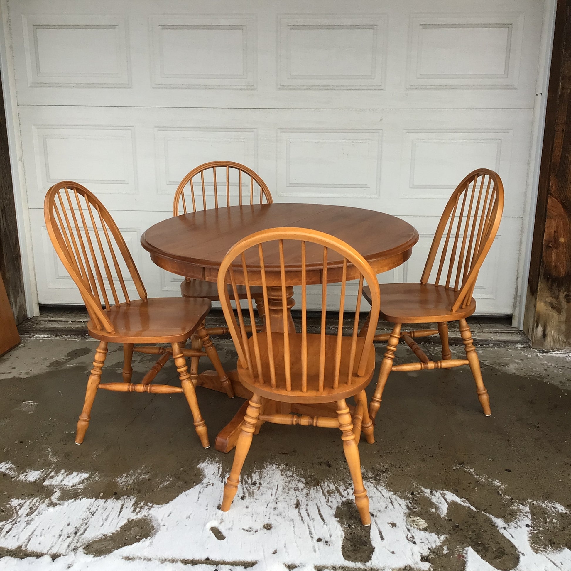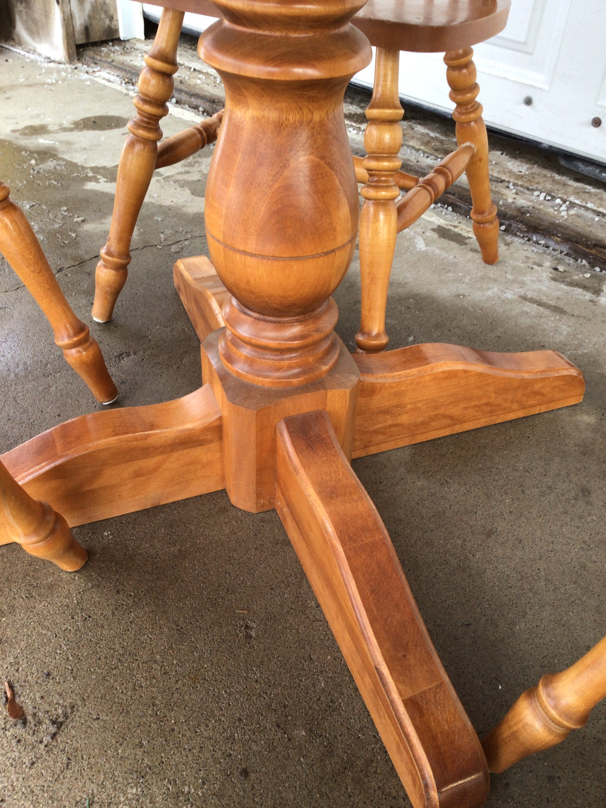 Wooden Pedestal Table with Four Chairs and Leaf - Simple dining table set, slightly worn with a some scratches (examples included in photos).