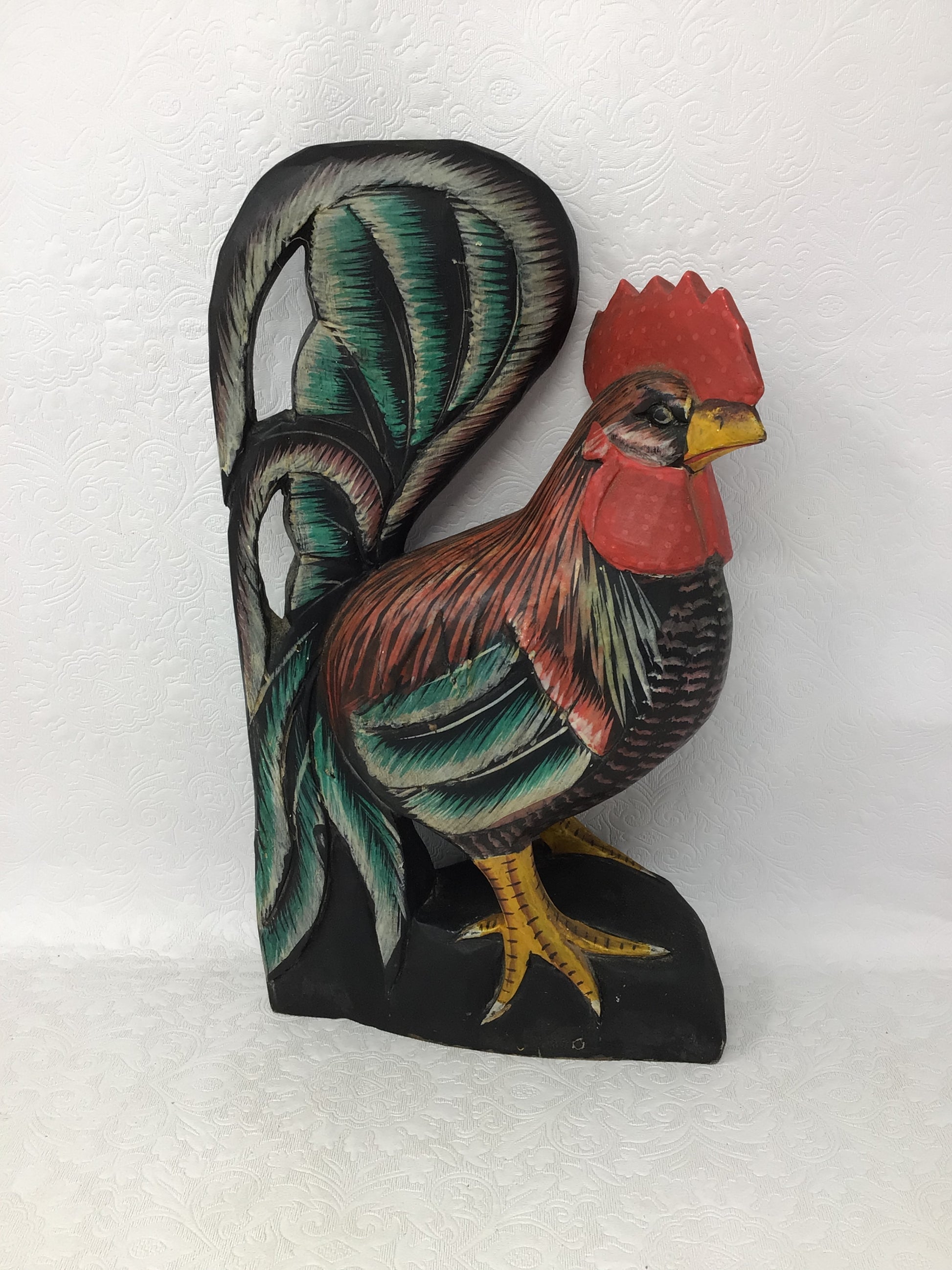 Wooden Rooster Figurine. This wooden hand carved and hand painted rooster figurine is in good condition. It is perfect for a farm house.